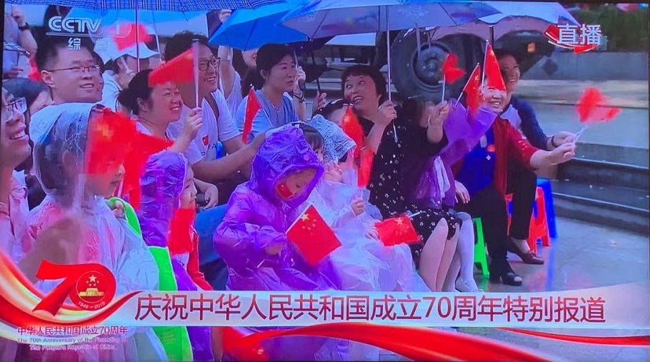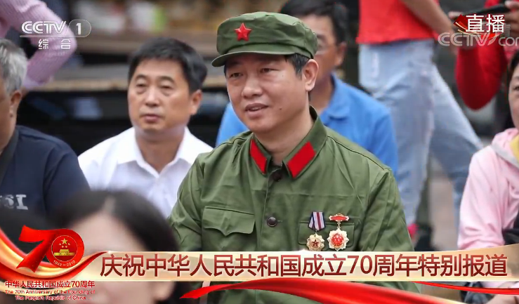 央视主持人在直播时介绍道,上午8点不到,社区居民就自发到现场,天空飘起小雨后仍然不愿意离去。当电视里传来“全场起立”的声音后,社区居民都自发起立、高唱国歌。活动现场还来了一位老兵,他特意在这个特殊的日子里穿上军装、配上勋章,来到现场感受活动氛围。