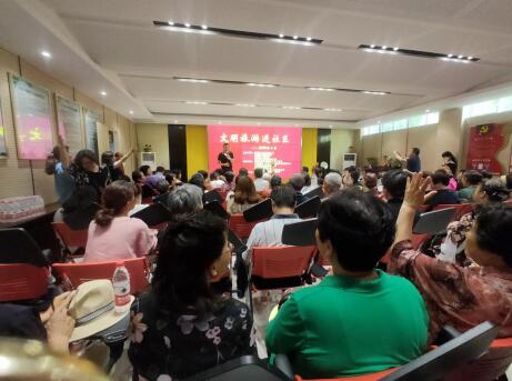 在活动上,江苏健康广播主持人蓝天通过一系列的图片资料以及自己和听友的旅游经历向大家讲述了文明旅游的重要性。建邺区文旅局工作人员孟红利朗诵了自己的原创诗歌《文明旅游畅天下》,字正腔圆的朗诵让文明旅游理念深入人心。此外,荣获2018年全国陶笛之星青年组金奖的李毓文精彩的陶笛演奏也让现场社区居民连连陈赞。
