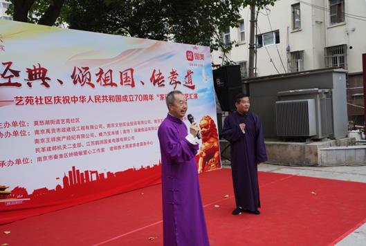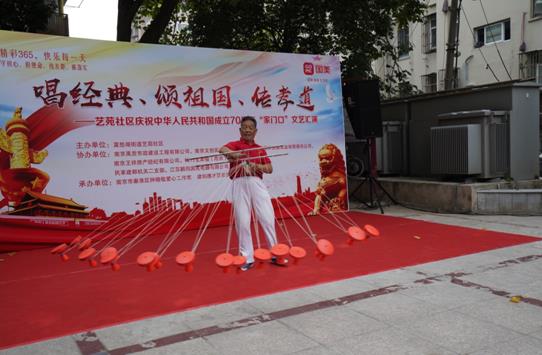 9月27日上午,南京莫愁湖街道艺苑社区小广场上,掌声、欢呼声、喝彩声不断,数百位居民聚在一起,观看精彩的演出。为庆祝新中国成立70周年和即将到来的重阳节,营造良好的社区文化氛围,丰富居民的文化生活,艺苑社区与社区大党委、“两新”组织等共建单位联合举办“唱经典、颂祖国、传孝道——庆祝新中国成立70周年‘家门口’文艺汇演”,歌颂祖国,传承孝道。