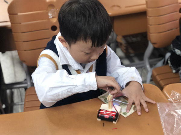 活动开始前,老师先介绍本次活动需要用到的零件器材,在和同学们确认零件器材完整后,活动正式开始。在老师的引导下,同学们先搭建号一个H型的立体支架,接着用电路板固定在支架的上下两端。在搭建好大致的模型后,同学们固定上电池盒,连接上电线,接上验钞灯泡,最后装上两节电池,验钞机的灯泡亮起来了!随后,老师拿出准备好的纸币,让同学们用验钞机看灯照出来的水印。在家长们的积极配合下,同学们不断发挥自己的想象力,创造出样式各异的验钞机。
