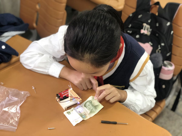 在完成自己的验钞机并试验完成后,老师向同学们讲解了验钞机的灯为什么会亮的原理:电池发电形成电流,从正极流向负极,形成闭合回路。老师的话解开了同学们心中的困惑,激发了同学们不断求知的欲望。