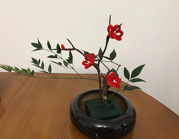 此次课程花道老师教大家制作简易的绒花,制作绒花的主要材料有:彩色毛毛条、黑色枝丫的铁丝、塑料小花托和热胶枪。首先老师向大家演示了一遍制作方法,首先将彩色毛毛条慢慢折弯,弯成梅花的形状,在每个分节点点上热熔胶,使其固定成型,将折好的花瓣绒条呈立体展开式的花朵形状固定在黑色枝丫的铁丝上,最后在中间缝隙中涂抹上一圈热熔胶,再粘上塑料花托,一朵美丽鲜艳的梅花就制作完成啦。学员们在看完老师的教学后,跃跃欲试,一丝不苟地动起手来,制成了一朵朵鲜活的梅花,十分逼真可爱。